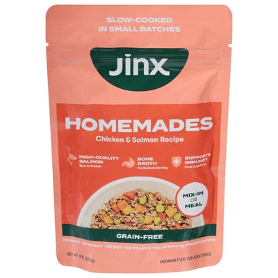 PRODUCT DETAILS: Calorie Content ME (Calculated): Metabolizable Energy (ME) 1,050 kcal/kg; 268 Kcal/ 255g (9oz) Jinx Chicken & Salmon Recipe Homemades is formulated to meet the nutritional levels established by the AAFCO Dog Food Nutrient Profiles for Maintenance. Premium food for adult dogs. No corn, wheat or soy. Slow-cooked in small batches. Bone Broth: For nutrient density. Supports Immunity from superfoods. Mix-in or meal. Grain free. Real, simple, and ready to serve. Feed as a Meal: A soft & savory, whole & balanced meal. Or Mix It In: Enhance mealtime with slow-cooked goodness. They'll think it fell off your dinner table. These fully cooked pouches are filled with antioxidant-rich superfoods and real, hearty proteins. 100% Satisfaction Guarantee: Your dog's happiness is our top priority. If your dog is not satisfied, let us know and we'll make it right. thinkjinx.com. Questions? visit our website at thinkjinx.com or contact us at support@thinkjinx.com. Product of Thailand.