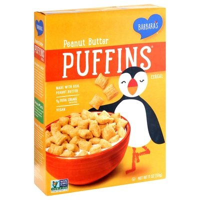 PRODUCT DETAILS: Made with real peanut butter. 9 g total sugars (per serving). Vegan. Non GMO Project verified. nongmoproject.org. This is the puffin life! Puffins usually have the same mate and nest in the same spot every year. A puffin pair will have only one chick each year. Puffins live to about 20 years old. We believe in better. We believe in better health and better taste. We believe in better breakfasts. We believe in better options like whole grains and non-GMO ingredients. Better is a simple idea that holds a whole bunch of promise. That's why we've believed in better from the start. Crushin' on that crunch. This product is sold by weight not volume. Some settling of contents may have occurred during shipping and handling. Barbara's Promise: Since 1971, Barbara's has been following one simple goal - create wholesome food that tastes delicious. We go back to the basics and use wholesome ingredients that you can feel confident your family will love. If you're not happy with the quality of this product, contact us for a full refund. Please provide a "best if used by" date and the package UPC. projectpuffin.org. barbaras.com. Let's connect: Facebook: (at)barbarasbakery. Instagram: (at)barbarasbakery. barbaras.com. Call us at 1-866-465-4633 M-F 8am-4pm Central Time. Barbaras.com. Project Puffin: Even the cutest animals need a little help. Barbara's is a longtime supporter of the National Audubon Society's Project Puffin, which protects puffins and other rare and endangered seabirds worldwide. Read all about it and see more cute photos at projectpuffin.org. Try our other yummy puffin cereals: puffins original; puffins cinnamon; puffins gluten-free multigrain. Barbara's Earth: This box helps save trees! We proudly use 100% recycled materials for our cartons. This carton is made from 100% recycled cardboard. Minimum 35% post consumer content. If possible, please recycle again. Consult with your local recycling agency to ensure this material is recyclable in your comnunity.
