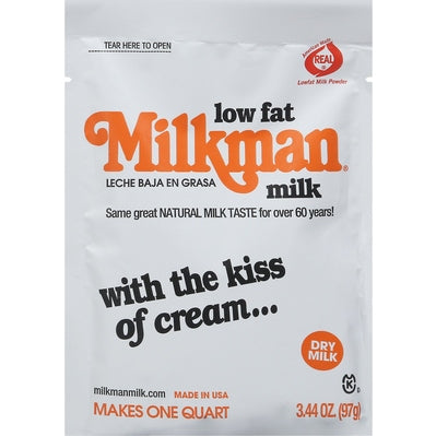 PRODUCT DETAILS: Under 100 calories per serving. Low Fat. Real. American made. Lowfat milk powder. Same great natural milk taste for over 60 years. With the kiss of cream. Makes on quart. Same delicious flavor - we're back! Milkman is made with a kiss of cream for delicious natural milk taste! milkmanmilk.com. Instagram: milkmanifmilk. Facebook:/kissofcream. Twitter: (at)milkmanLFmilk. Made in USA.