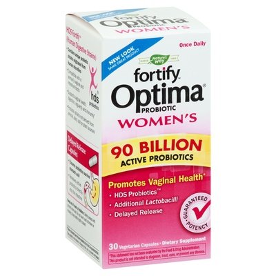 PRODUCT DETAILS: Dietary Supplement. No artificial colors or flavors. Gluten free. No sugar, salt, wheat, artificial colors or flavors. New look! Same great product. Once daily. Since 1969. Promotes vaginal health. HDS probiotics. Additional lactobacilli. Delayed release. Guaranteed potency. Why take Fortify Optima Women€™s? Fortify Optima Women's formula contains a specialized ratio of probiotics (90% Lactobacilli / 10% Bifidobacteria) to balance the microflora of a woman€™s vaginal tract. Benefits of taking the formula include: Fortifying & balancing vaginal flora. Unique Multi-Strain Benefits. 90 billion active probiotic cultures for maximum support. 10 unique HDS probiotic strains (Lactobacilli + Bifidobacteria) to support vaginal health, plus the small and large intestine. Contains 90% Lactobacilli strains, the dominant good bacteria in a healthy vaginal tract. HDS Fortify (Human Digestive Strains): Contains unique probiotic strains originated from human microflora. Compatible with a woman€™s vaginal and intestinal tracts. Supports vaginal health, digestion, regularity and immunity. Probiotics strains not derived from animal, dairy, soil or plant sources. Delayed Release Capsules: Ensures probiotics survive stomach acid. Release active probiotics directly into the intestine. 90 billion active probiotics. naturesway.com. Questions? 1-800-9Nature / naturesway.com. (These statement have not been evaluated by the Food and Administration. This product is not intended to diagnose, treat, cure, or prevent any disease.)